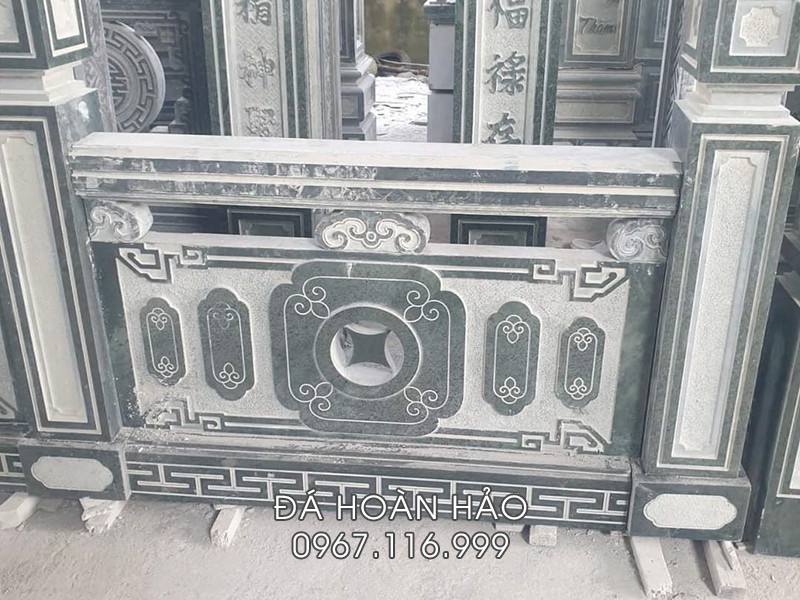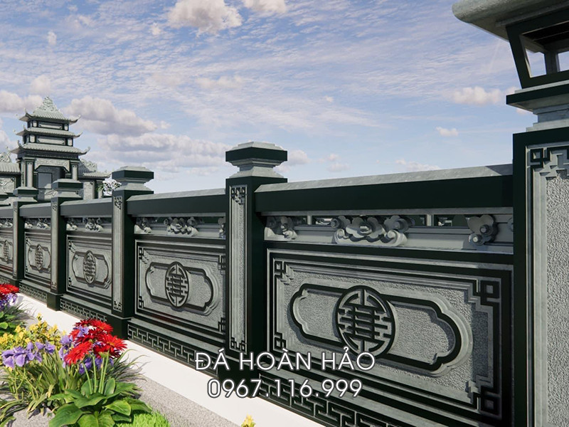 Được thiết kế đồng bộ với mộ đá và lăng thờ. Mẫu lan can này thường có chiều cao vừa phải (từ 45cm – 81cm), chạm khắc hoa văn chữ Thọ hoặc hoa sen, giúp khu lăng mộ trở nên gọn gàng và trang trọng.
